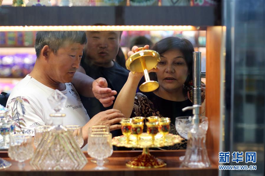 9月4日,在新疆塔城地區(qū)巴克圖口岸,顧客在絲路文化商品城內(nèi)選購商品。 新華社記者程麗攝