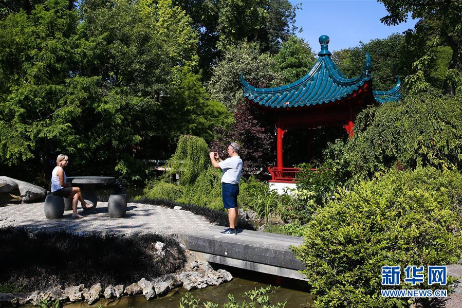 8月24日,在比利時(shí)布呂熱萊特市,游客在天堂動(dòng)物園的“中國園”拍照留念。新華社記者 鄭煥松 攝
