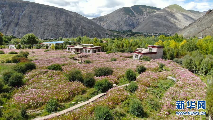 9月13日無(wú)人機(jī)拍攝的尼木縣山谷間盛開的波斯菊。 新華社記者 晉美多吉 攝