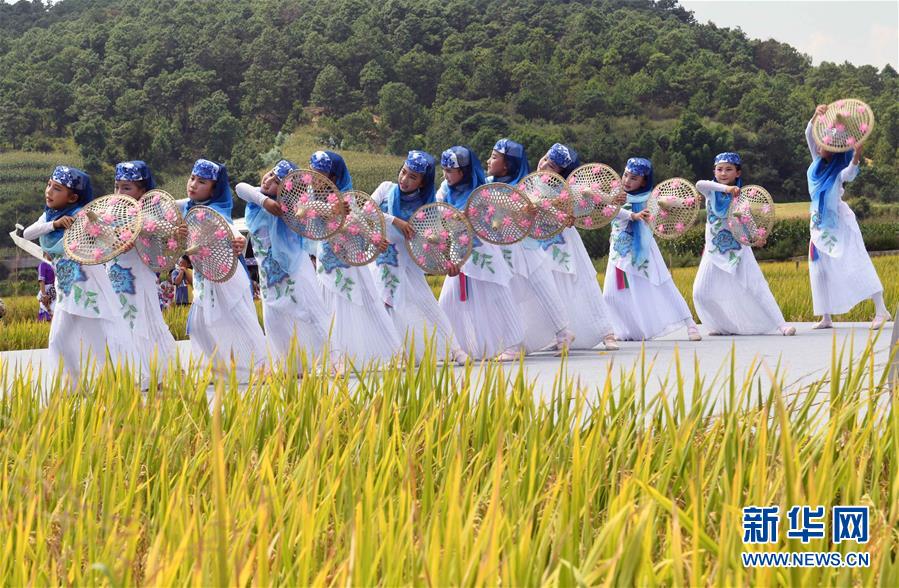 9月15日,孩子們在田野里表演舞蹈《豐收麥田》。 金秋時(shí)節(jié),云南省尋甸回族彝族自治縣在七星鎮(zhèn)魯古村舉行慶祝豐收活動(dòng)。 新華社記者 楊宗友 攝