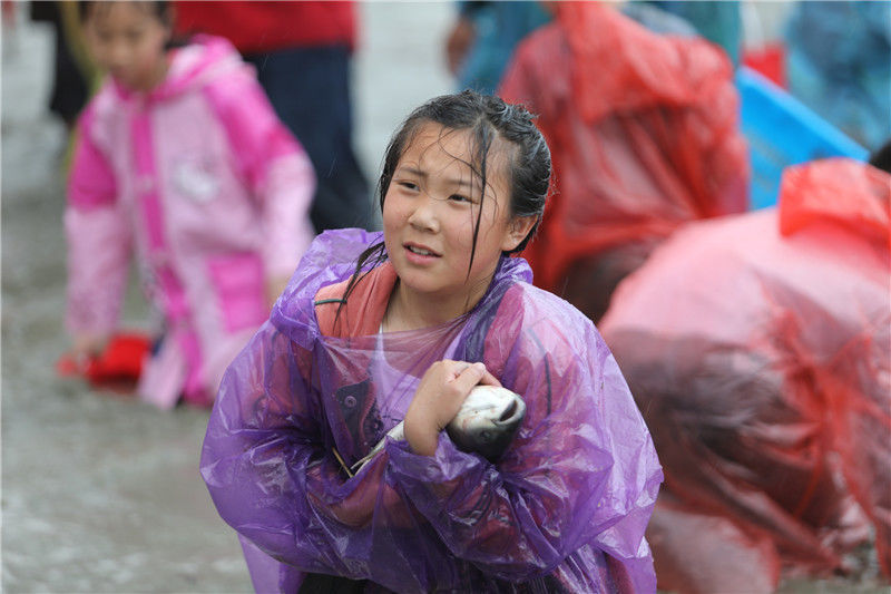 一名小朋友在“鬧魚”活動中抓得一條活魚。