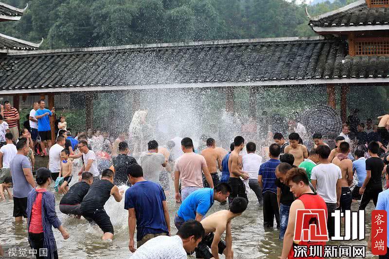 苗族群眾在活動場地內(nèi)爭搶活魚,搶的魚越多,寓意福氣就越多。