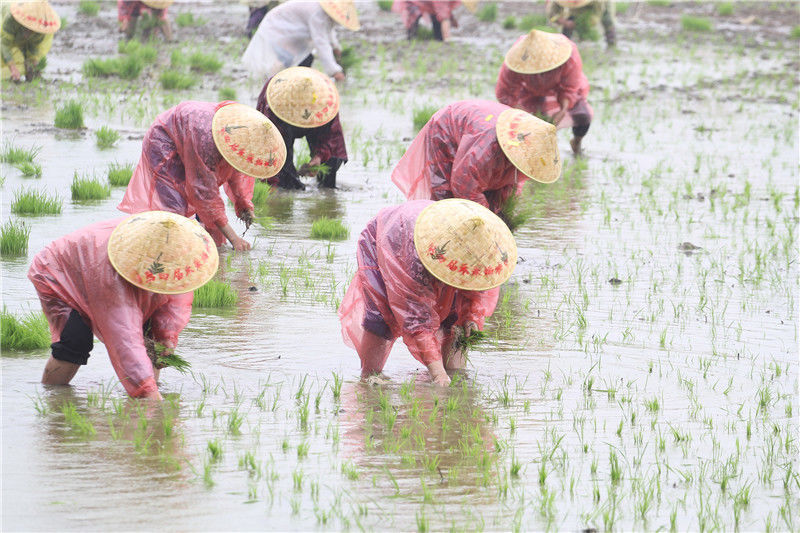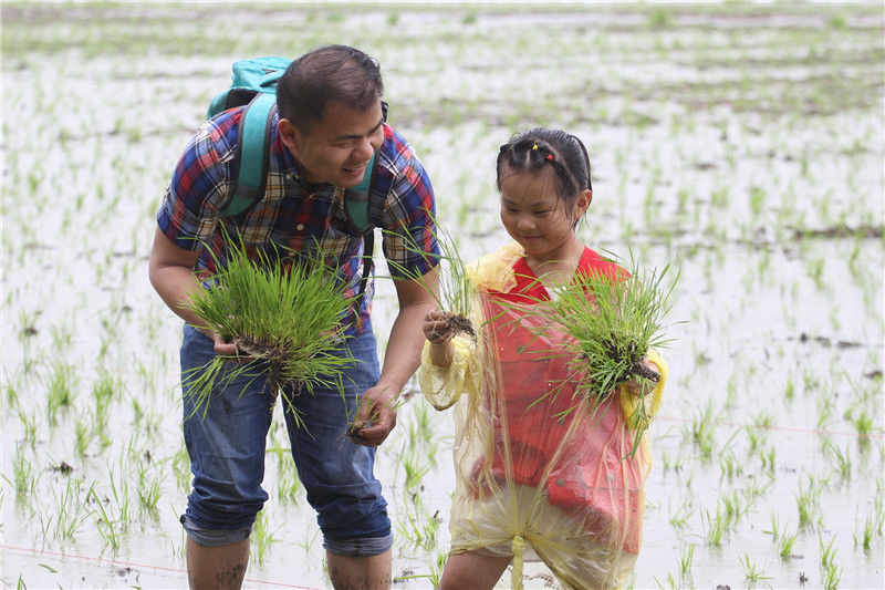 2019年5月26日,江蘇淮安市洪澤區(qū)岔河鎮(zhèn)舉辦“插秧節(jié)”活動,游客通過手工插秧比賽、親子插秧體驗(yàn)、稻田抓魚、稻田拔河等趣味游戲體驗(yàn)農(nóng)耕樂趣,感受田園生活。陳凱/視覺中國 編輯/陳進(jìn)
