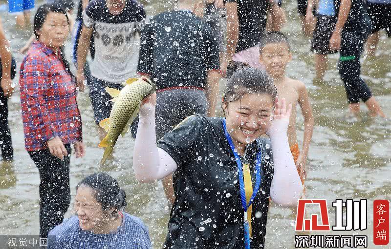 苗族群眾在活動場地內爭搶活魚,搶的魚越多,寓意福氣就越多。