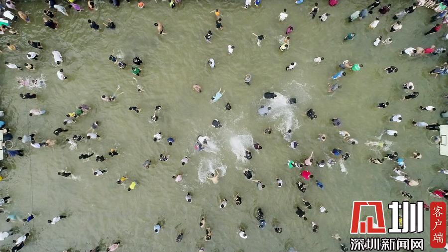 在廣西柳州市融安縣安寧村大袍屯,苗族群眾和游客在“鬧魚”活動中抓魚。