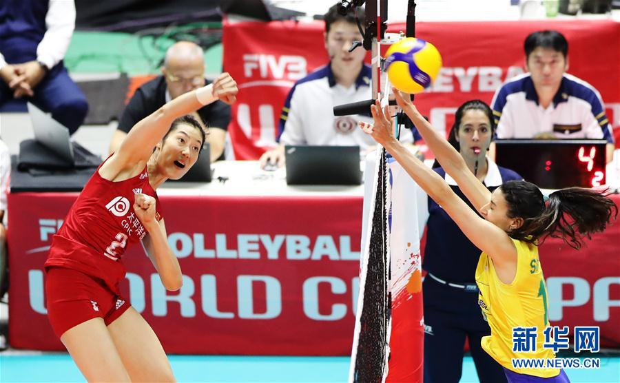 9月22日,中國隊球員朱婷(左)在比賽中扣球。當(dāng)日,在日本札幌舉行的2019年女排世界杯賽第二階段A組循環(huán)賽比賽中,中國隊以3比2戰(zhàn)勝巴西隊。新華社記者杜瀟逸攝