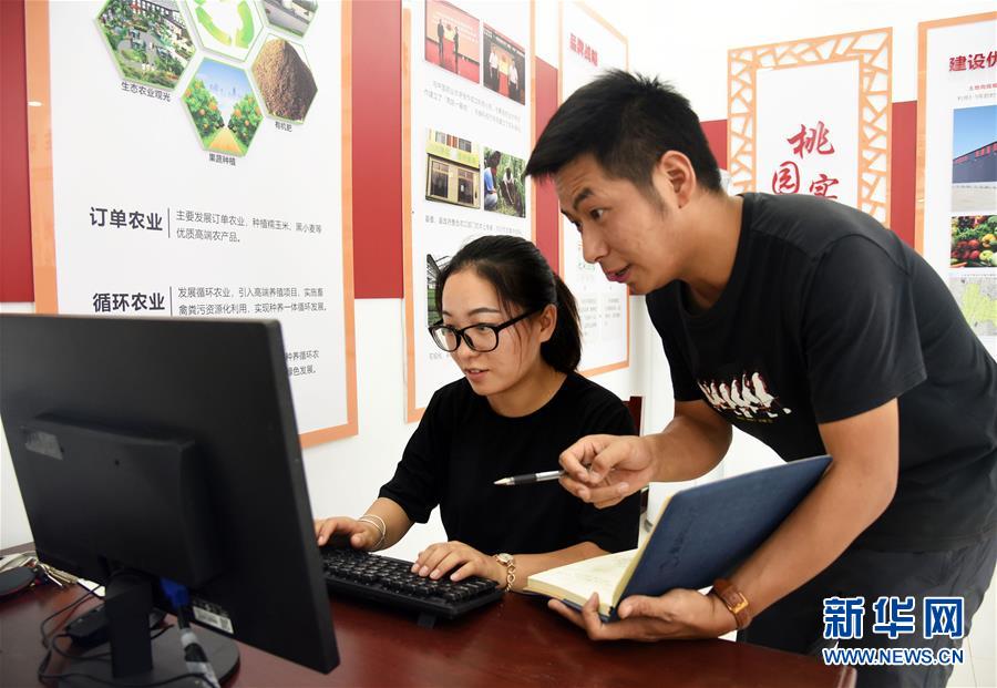在山東省德州市平原縣的農(nóng)場(chǎng)里,楊春雷(右)和卜璐璐在辦公室將查看農(nóng)田記錄的數(shù)據(jù)錄入電腦,以便進(jìn)行數(shù)據(jù)分析(8月22日攝)。 新華社記者 王凱 攝