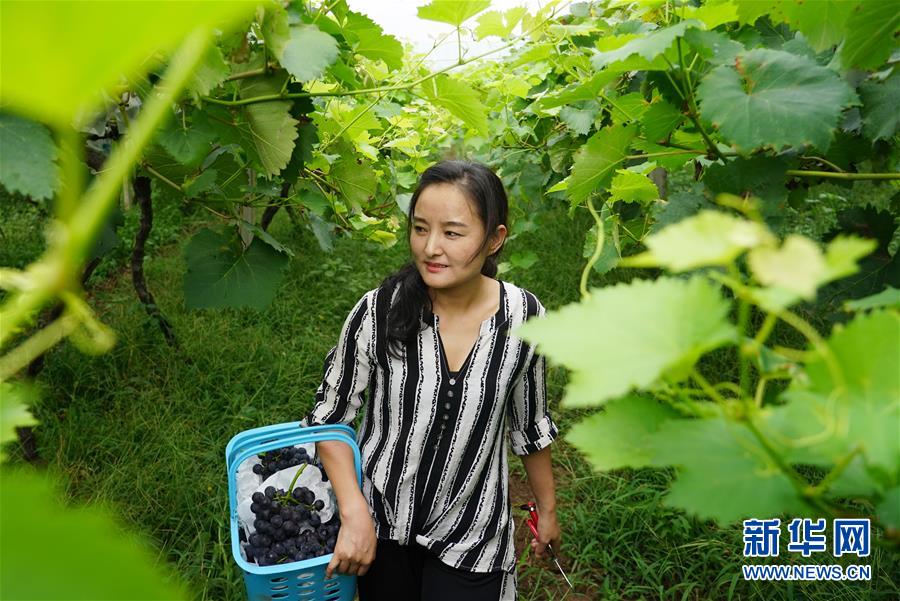 王衛(wèi)花在葡萄園采摘葡萄(8月21日攝)。 新華社記者 邵瑞 攝