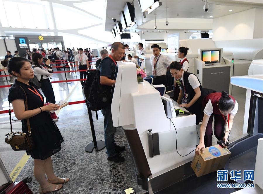 9月25日,工作人員在北京大興國際機(jī)場為乘客辦理行李托運。新華社記者張晨霖攝