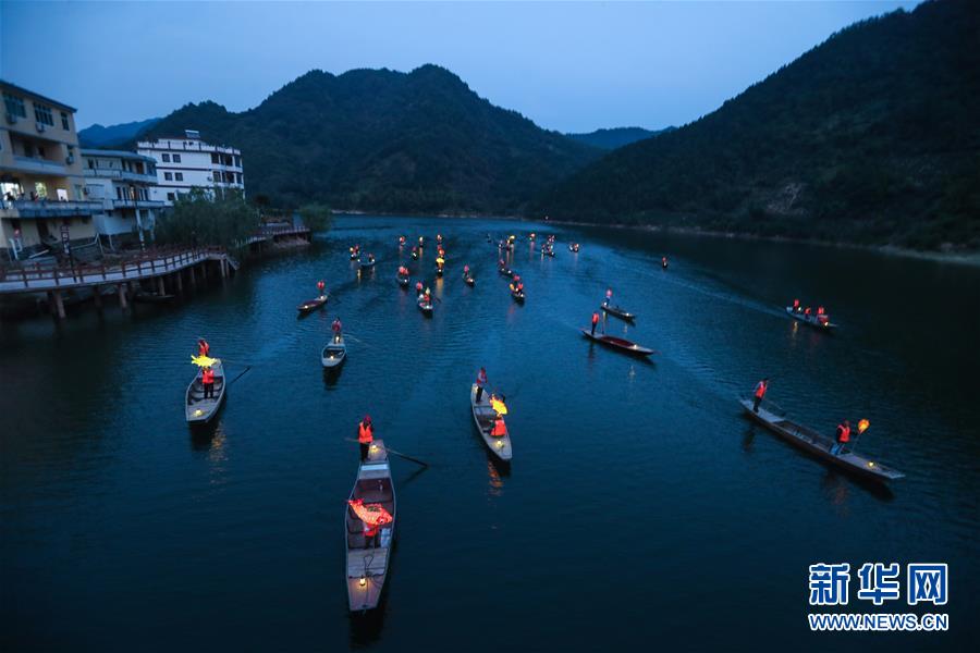 9月25日,在宋村鄉(xiāng)云源港的水面上,漁民劃著漁船,船頭點亮漁燈,構(gòu)成一幅“漁舟唱晚、萬家燈火”的美麗圖景。 新華社記者 徐昱 攝