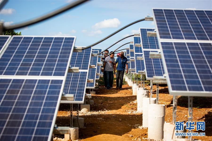 2013年11月3日,中古雙方施工人員在古巴首都哈瓦那市郊的展覽中心園區(qū)的中國援建的光伏電站內(nèi)工作。2013年11月4日,由中國北京控股集團有限公司捐建的古巴1兆瓦光伏電站正式并網(wǎng)發(fā)電。該項目為中古合作共建,中方提供設備及技術(shù)指導。新華社記者劉彬攝