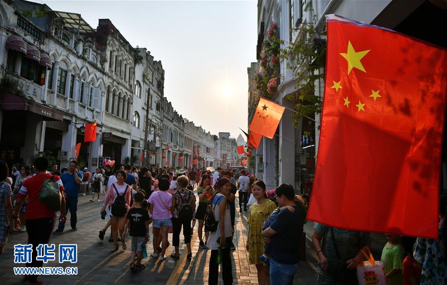 10月1日,游客在海口騎樓老街參觀游玩。當(dāng)日是國(guó)慶節(jié),全國(guó)各地的人們用各種方式歡度節(jié)日。新華社記者 郭程 攝