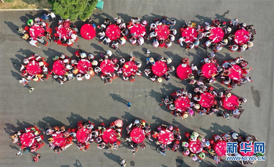 10月1日,在江西省南昌市南昌縣銀三角敷林村,當(dāng)?shù)卮迕衽e行“同吃國(guó)慶面 共迎國(guó)慶節(jié)”活動(dòng)(無(wú)人機(jī)拍攝)。當(dāng)日是國(guó)慶節(jié),全國(guó)各地的人們用各種方式歡度節(jié)日。新華社記者 彭昭之 攝