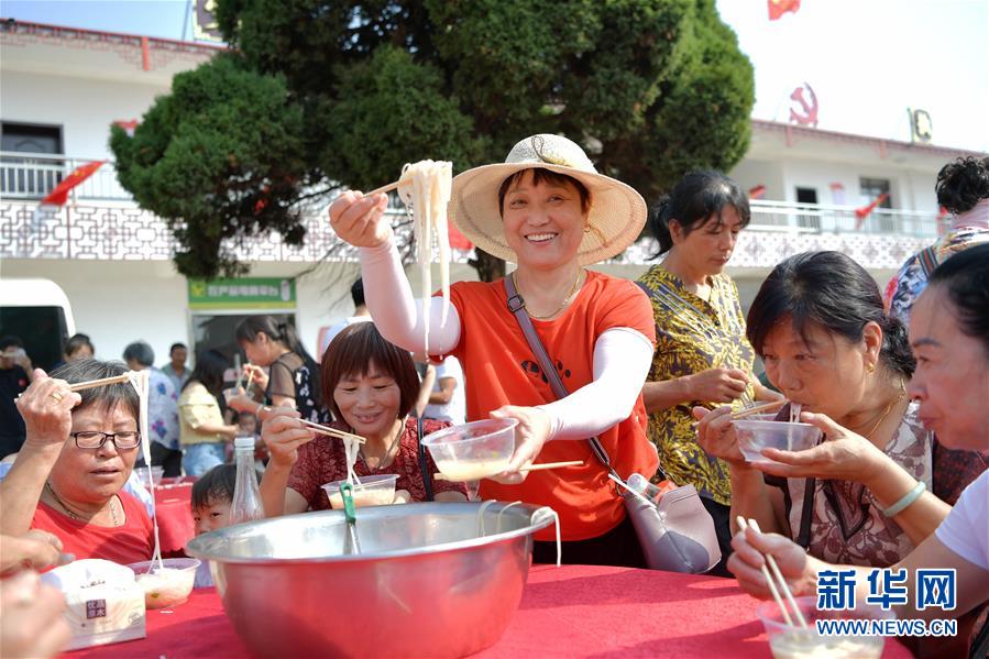 10月1日,在江西省南昌市南昌縣銀三角敷林村,當(dāng)?shù)卮迕衽e行“同吃國(guó)慶面 共迎國(guó)慶節(jié)”活動(dòng)。當(dāng)日是國(guó)慶節(jié),全國(guó)各地的人們用各種方式歡度節(jié)日。新華社記者 彭昭之 攝