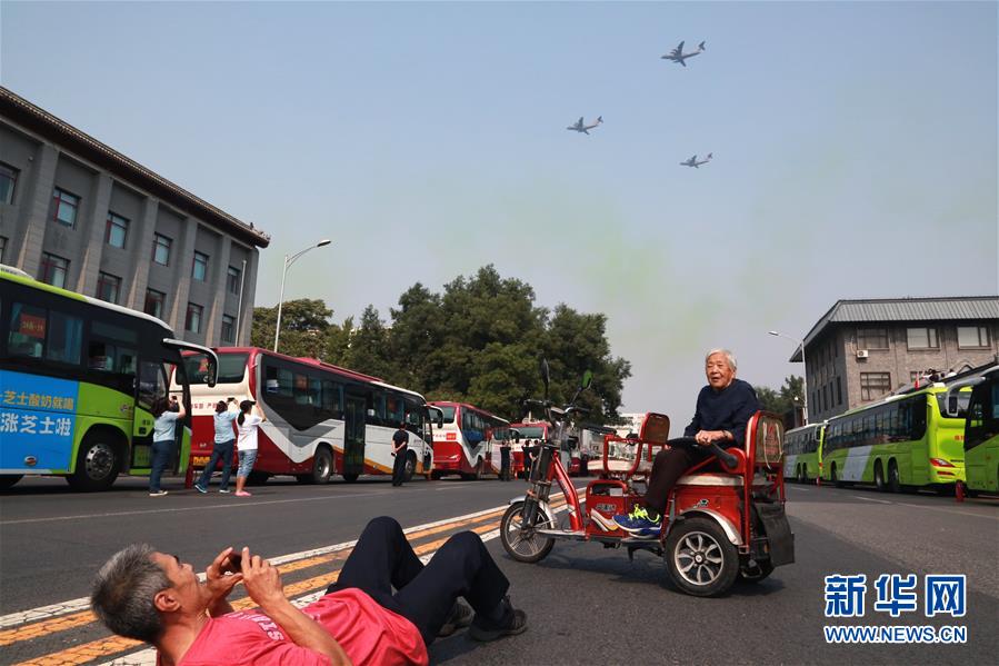 10月1日,在北京琉璃廠,當(dāng)受閱飛機(jī)飛過(guò)時(shí),北京市民趙先生(左)為92歲的老母親拍照留影。當(dāng)日是國(guó)慶節(jié),全國(guó)各地的人們用各種方式歡度節(jié)日。新華社記者 薛東梅 攝