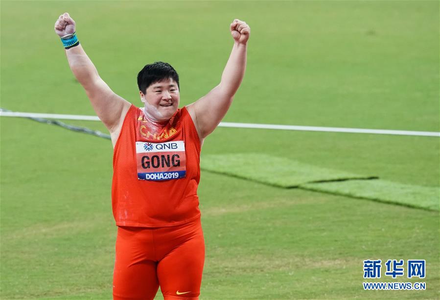 當(dāng)日,在卡塔爾多哈舉行的2019國(guó)際田聯(lián)世界田徑錦標(biāo)賽女子鉛球決賽中,衛(wèi)冕冠軍、中國(guó)選手鞏立姣以19米55的成績(jī)奪得冠軍。 新華社記者王婧嬙攝