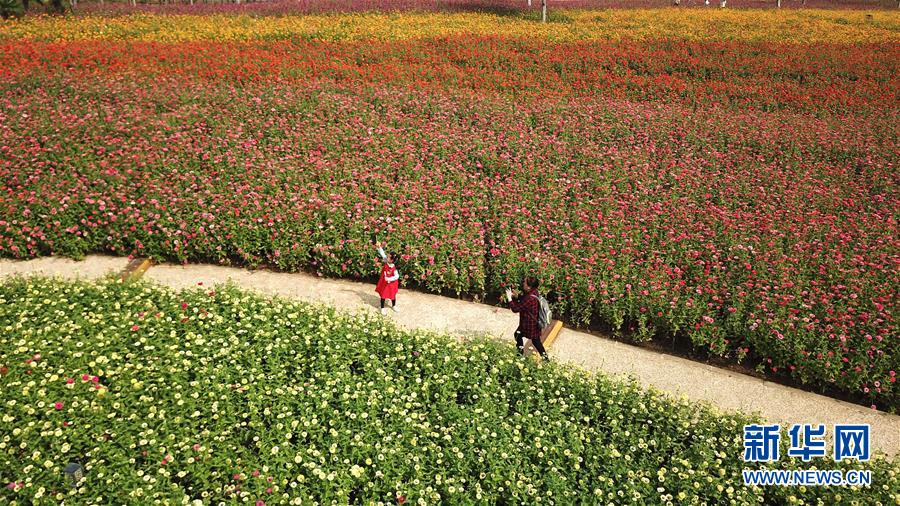 10月9日,小朋友和家長在四季花海城市公園游玩(無人機拍攝)。 秋日時節(jié),位于安徽省合肥市的四季花海城市公園花香四溢,色彩繽紛,成為游客和市民休閑游玩的好去處。 新華社記者 張端 攝