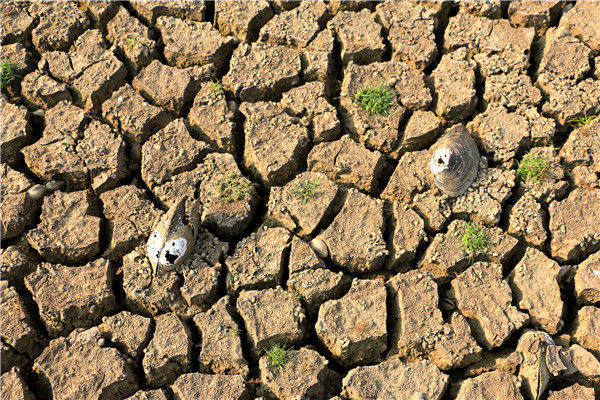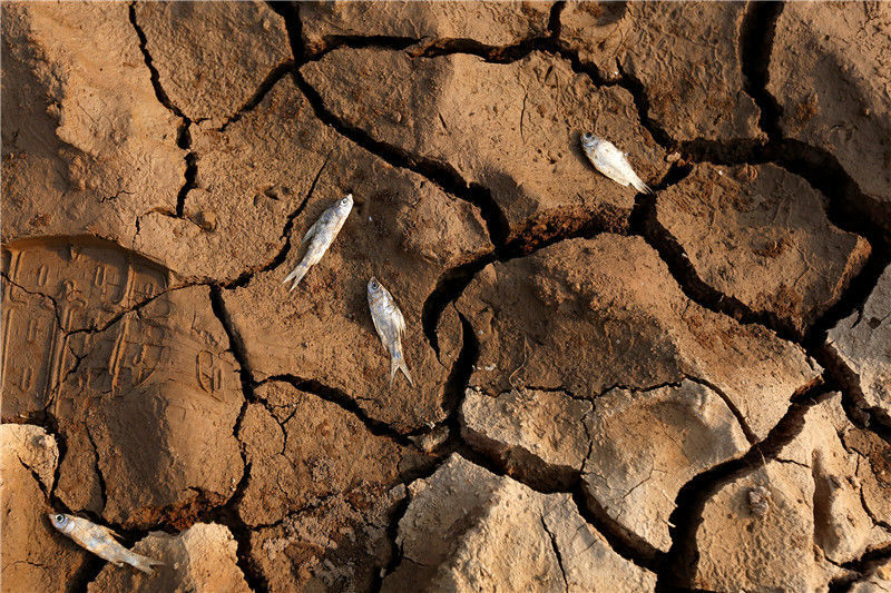 2011年9月21日,江西鄱陽(yáng)湖,一條沒(méi)來(lái)及逃離的魚(yú)干死在河床上。