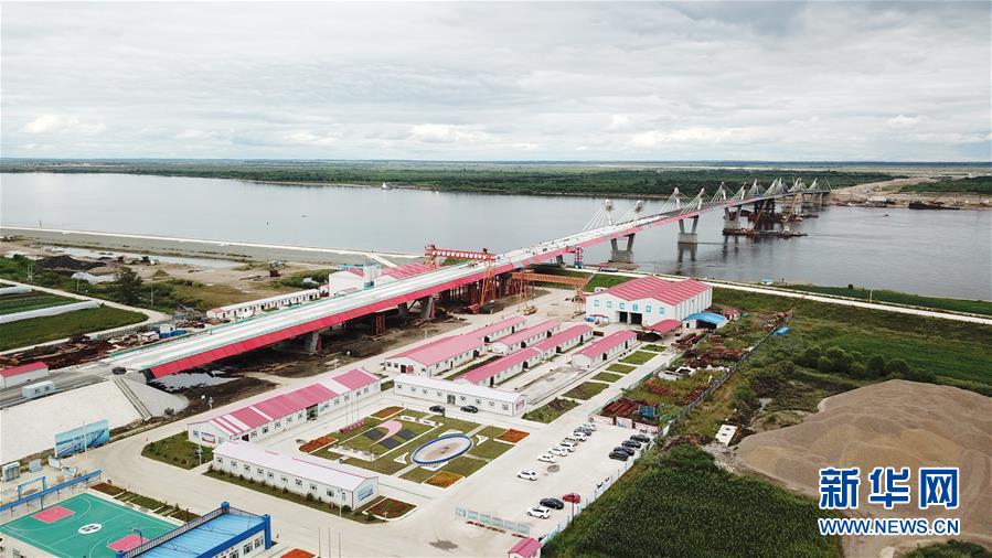 正在進(jìn)行橋面鋪裝施工作業(yè)的黑河到布拉戈維申斯克黑龍江(阿穆爾河)大橋(8月19日無人機(jī)拍攝)。新華社記者王建威攝