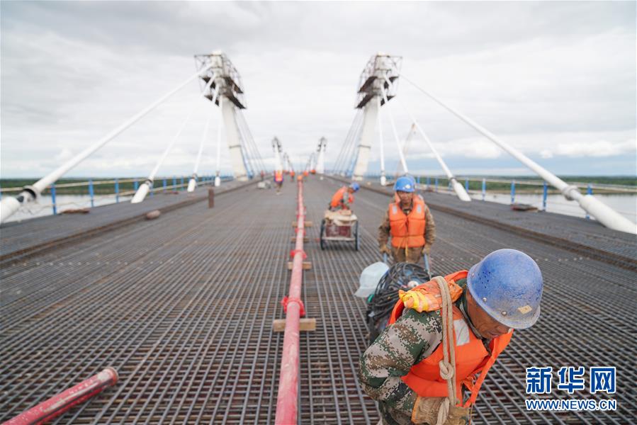 工人在大橋上進(jìn)行橋面鋪裝施工作業(yè)(8月19日攝)。新華社記者王建威攝