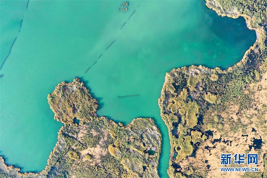 這是新疆博斯騰湖濕地一景(10月12日無人機(jī)拍攝)。入秋以來,新疆博斯騰湖碧波蕩漾,美景如畫,吸引各地游客前來游玩。新華社記者丁磊 攝