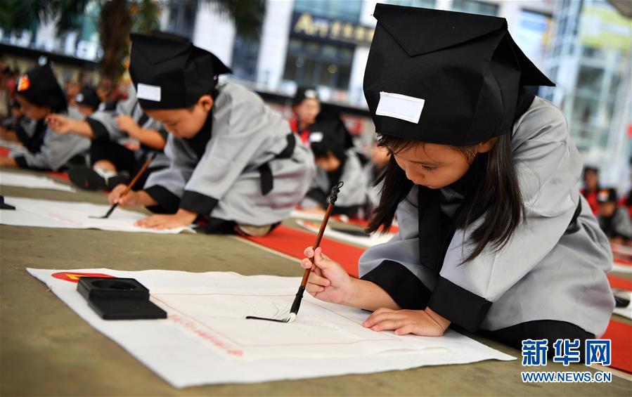 10月13日,參加儀式的小朋友在書寫“人”字。當(dāng)日,海口胡畫少兒藝術(shù)中心為500名小朋友舉行“開(kāi)筆禮”,通過(guò)“點(diǎn)朱砂,啟智慧”“習(xí)書法,描人字”等儀式讓孩子們體驗(yàn)中國(guó)傳統(tǒng)文化。新華社記者郭程攝