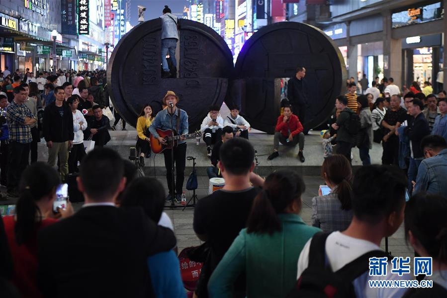 10月12日,長沙黃興路步行街持證上崗的街頭藝人在表演時吸引路人圍觀。新華社記者薛宇舸攝