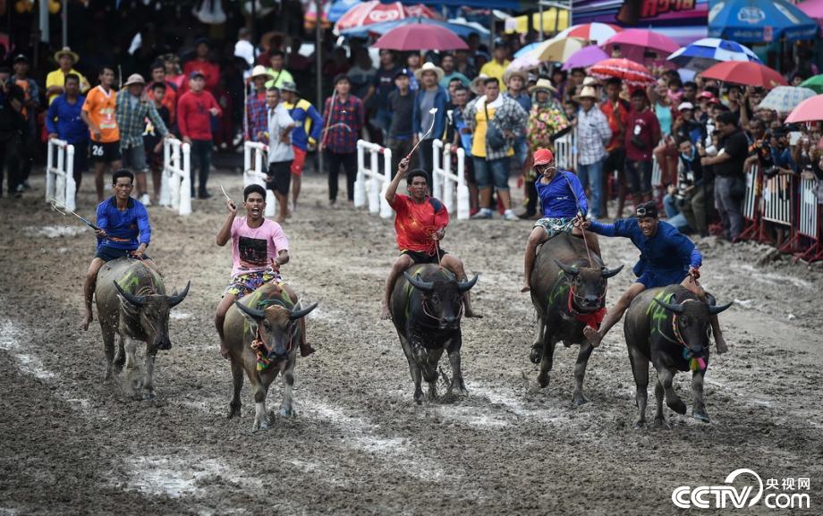 央視網(wǎng)消息:當(dāng)?shù)貢r(shí)間2019年10月12日,泰國(guó)春武里舉行一年一度的水牛賽跑,選手騎??癖?。視覺(jué)中國(guó)