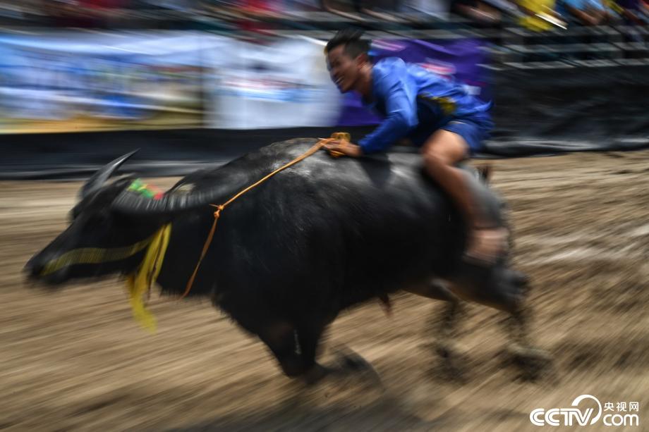 央視網(wǎng)消息:當(dāng)?shù)貢r(shí)間2019年10月12日,泰國(guó)春武里舉行一年一度的水牛賽跑,選手騎??癖?。視覺(jué)中國(guó)