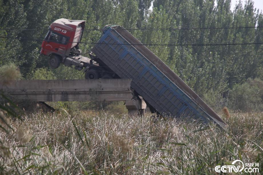 2019年10月13日,山東濱州,一輛滿載貨物的大貨車路過當(dāng)?shù)匾蛔鶎?米左右的小橋時(shí),致使橋面坍塌。據(jù)報(bào)道,13日凌晨4點(diǎn)左右,一輛重型半掛貨車沿渤海十八路由南向北行駛至市西辦事處李茂家村附近,右轉(zhuǎn)彎進(jìn)入連接渤海十八路與李茂家村村西鄉(xiāng)間路的一座寬4米左右的小橋時(shí),致使橋面坍塌。現(xiàn)場(chǎng)貨車呈翹起之勢(shì),車頭懸于半空中,車尾插入水中,事故未造成人員傷亡。據(jù)現(xiàn)場(chǎng)了解,該橋建設(shè)于1974年,橋頭有警示標(biāo)識(shí),警示承載4噸。目前救援工作正在緊張有序地進(jìn)行中。視覺中國(guó)