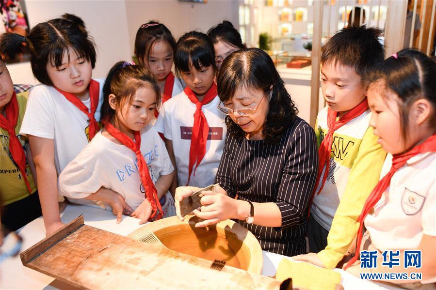 10月14日,善璉湖筆廠工人王曉華(右三)在非遺活態(tài)傳承館展示湖筆制作的水盆工藝。 新華社記者 黃宗治 攝