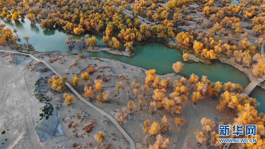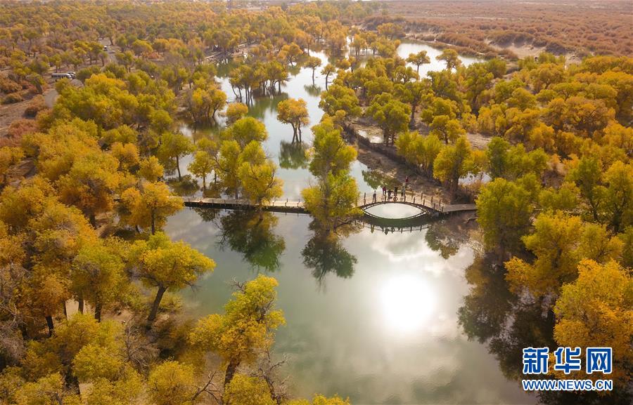 10月16日無人機拍攝的內(nèi)蒙古阿拉善盟額濟納旗境內(nèi)的胡楊林。新華社記者彭源攝