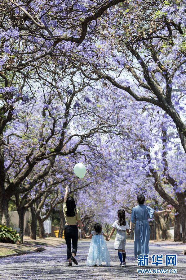10月20日,在南非比勒陀利亞,游人在藍(lán)花楹樹下賞花。新華社記者陳誠攝