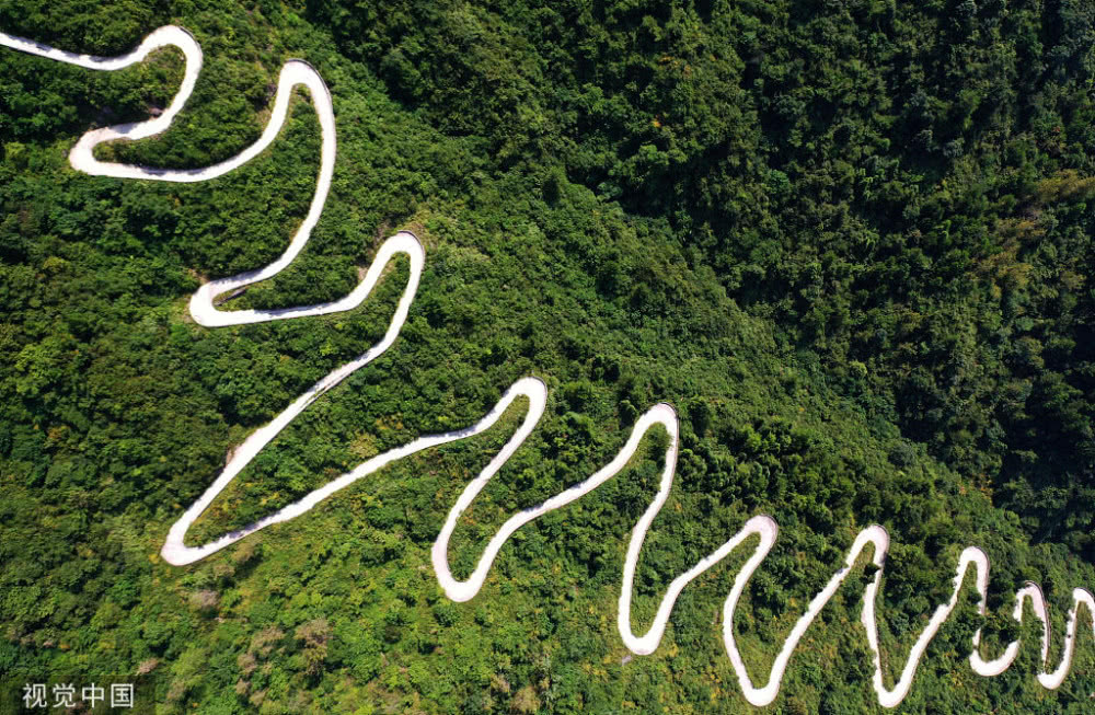 公路從山腳到山頂傾角約70度的山坡上以“S”形順山勢而建,蜿蜒盤旋,經(jīng)過堰渠溝、過橋溝、花尖、荒坡、卡門等懸崖地段,形成41道拐,猶如掛在懸崖上,甚是壯觀,成為了當?shù)匾坏里L景。