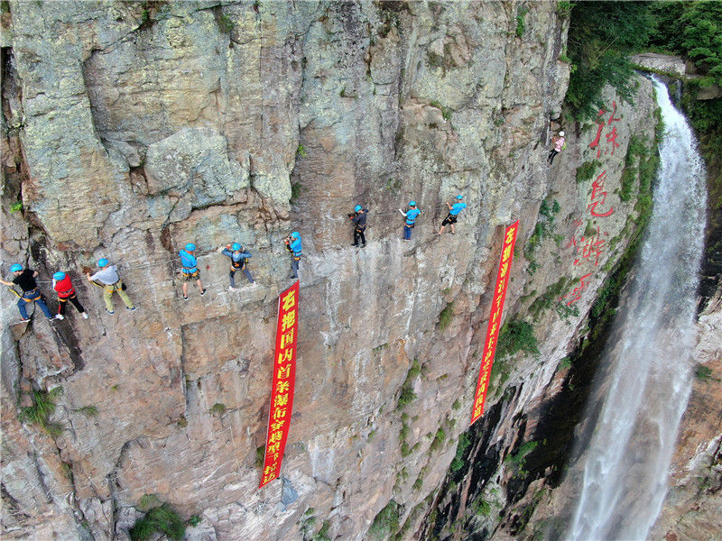 2019年6月28日,浙江寧波,游客在體驗(yàn)“懸崖鋼索棧道”項(xiàng)目。張培堅(jiān)/視覺中國