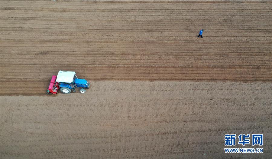 在河南省鞏義市西村鎮(zhèn)滹沱村,農(nóng)民駕駛機(jī)械在農(nóng)田中播種(10月24日無人機(jī)拍攝)。新華社記者馮大鵬攝