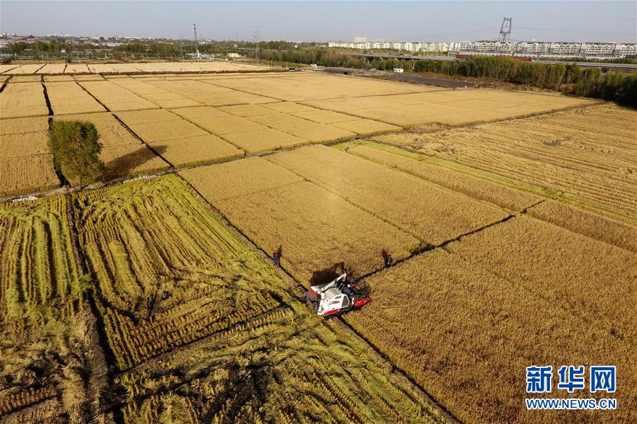 在太原市晉源區(qū)赤橋村,收割機(jī)在稻田里作業(yè)(10月28日無人機(jī)拍攝)。新華社記者詹彥攝