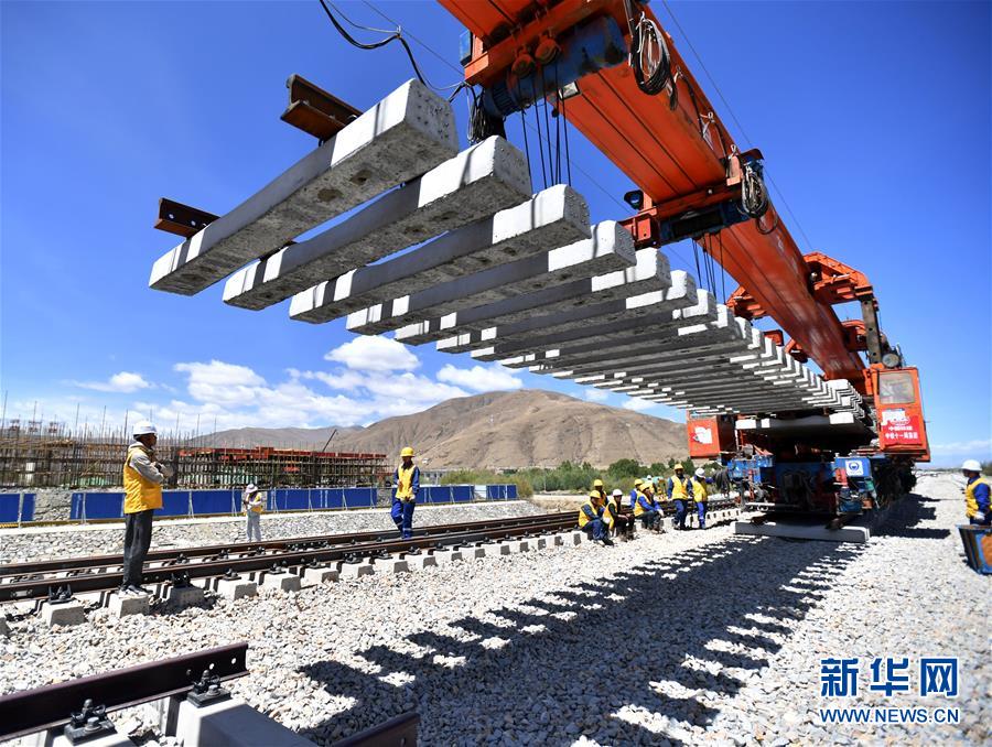 6月6日,負(fù)責(zé)鋪軌的中鐵十一局集團(tuán)的建設(shè)者在現(xiàn)場作業(yè)。新華社記者普布扎西攝