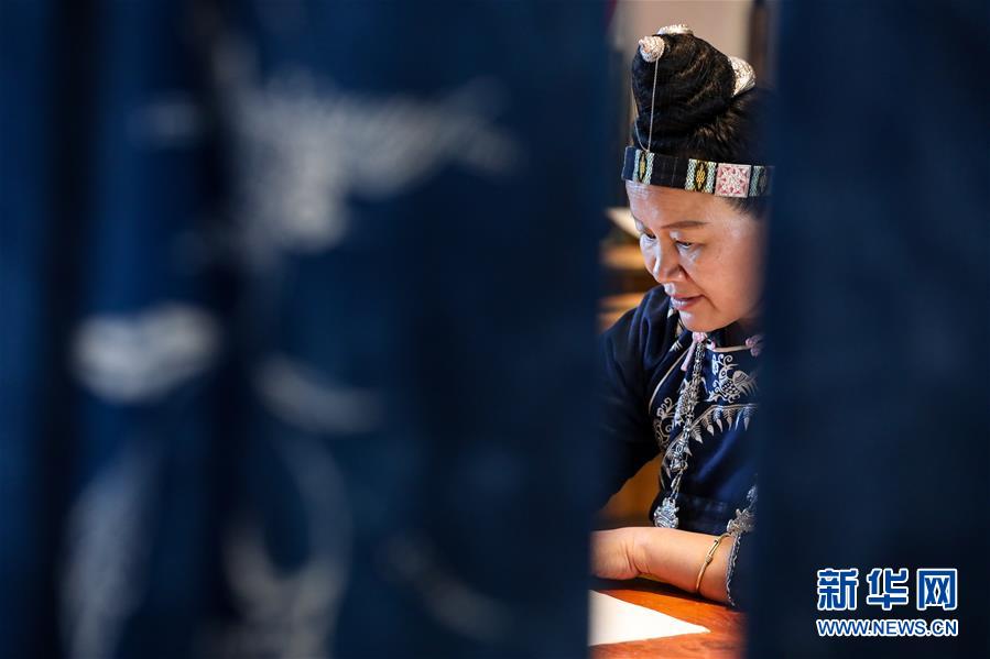 10月29日,楊芳在位于丹寨萬達小鎮(zhèn)內(nèi)的工作室內(nèi)繪制蠟染圖案。新華社記者 歐東衢 攝