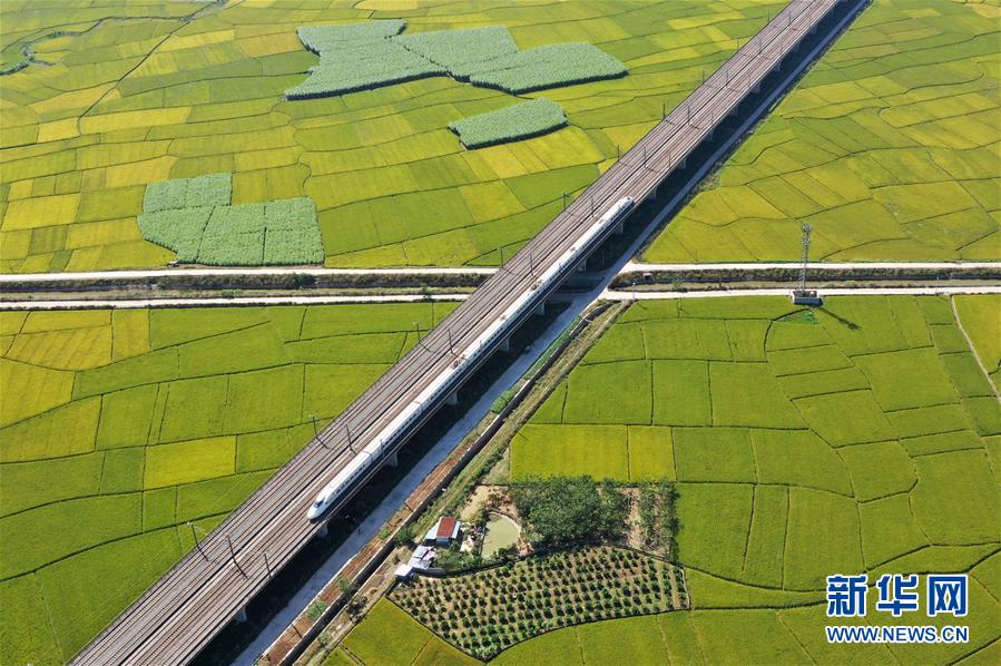 10月29日,列車從廣西賓陽縣古辣鎮(zhèn)豐收的稻田間駛過(無人機(jī)拍攝)。新華社記者陸波岸攝