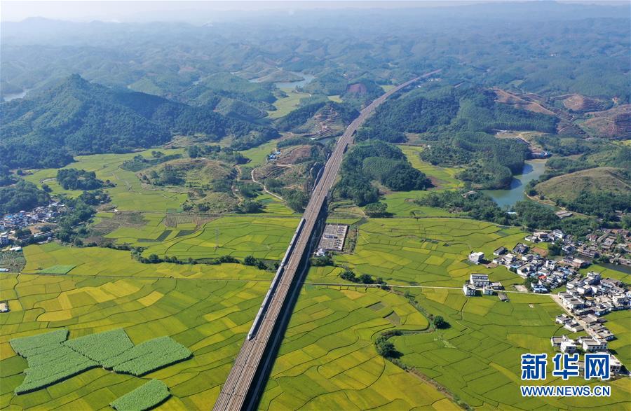 10月29日,列車從廣西賓陽縣古辣鎮(zhèn)豐收的稻田間駛過(無人機(jī)拍攝)。