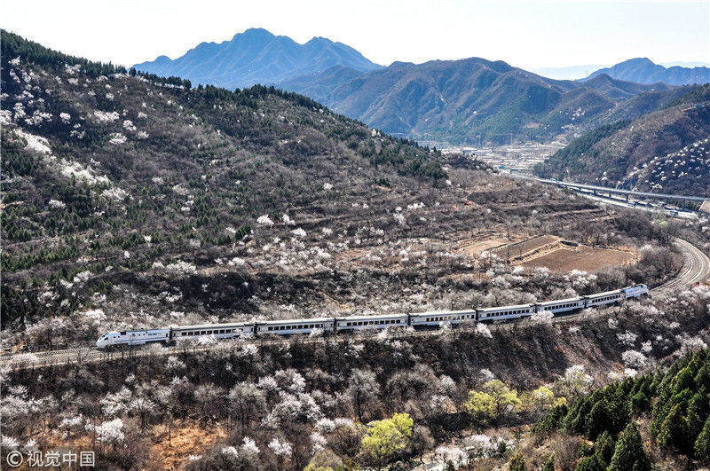 2019年3月22日,北京居庸關(guān)附近的山花盛開,S2線列車穿行在花海之中,構(gòu)成一幅美麗的畫面。時(shí)永平/千龍圖像/視覺中國(guó)編輯/陳進(jìn)