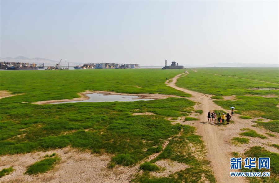 10月9日,江西省廬山市,游客行走在鄱陽湖湖區(qū)干涸的湖面上(無人機拍攝)。新華社記者胡晨歡攝