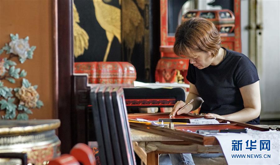 北京金漆鑲嵌有限責(zé)任公司技師在創(chuàng)作漆畫(huà)(10月31日攝)。新華社記者李欣攝