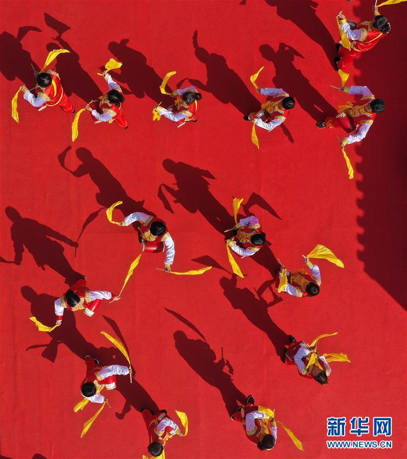 11月2日,南京仙林街道仙林新村社區(qū)居民腰鼓隊在千家宴上表演助興(無人機拍攝)。 新華社記者 季春鵬 攝