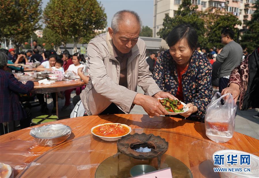 11月2日,南京仙林街道仙林新村社區(qū)居民錢序仁(左)和呂桂英帶上自己做的菜前來赴宴。 新華社記者 季春鵬 攝