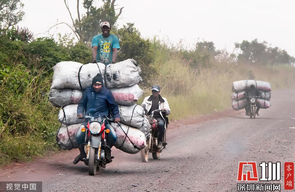 剛果,工人們將裝滿木炭的麻袋放在摩托車上,從維龍加國家公園運(yùn)到剛果戈馬市。