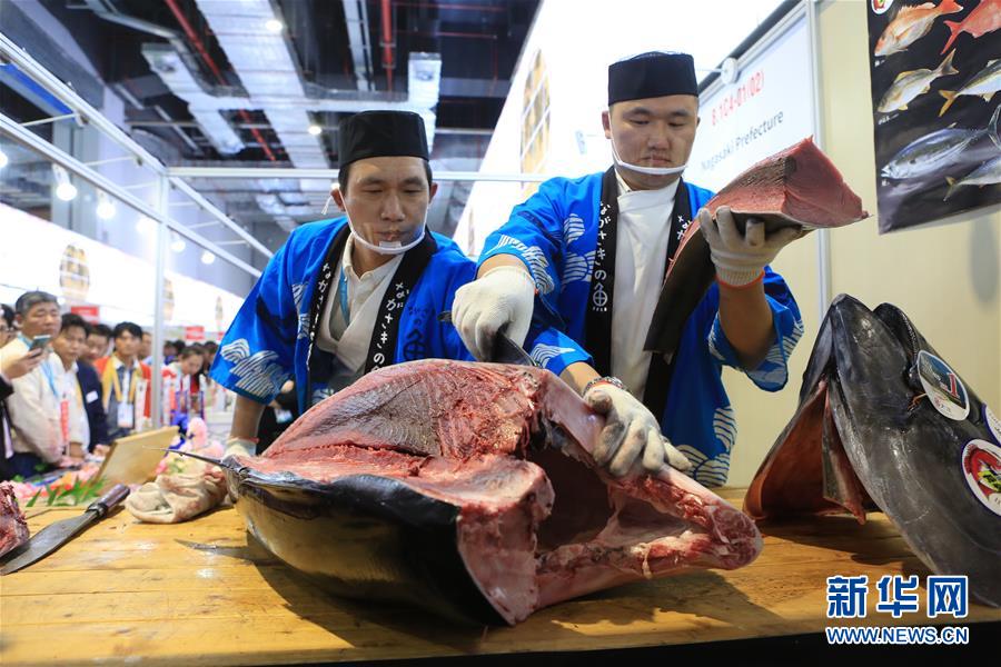 新11月7日,來自日本長(zhǎng)崎魚市株式會(huì)社的專業(yè)切魚師傅在現(xiàn)場(chǎng)解體70公斤藍(lán)鰭金槍魚。第二屆中國(guó)國(guó)際進(jìn)口博覽會(huì)正在上海國(guó)家會(huì)展中心舉行。博覽會(huì)的食品及農(nóng)產(chǎn)品展區(qū)里匯集了來自世界各地的美食,同時(shí)也上演各種精彩美食秀。11月7日,來自日本長(zhǎng)崎魚市株式會(huì)社的專業(yè)切魚師傅現(xiàn)場(chǎng)解體一條70公斤的藍(lán)鰭金槍魚,吸引大量參觀者觀看、品嘗。新華社記者隋先凱攝