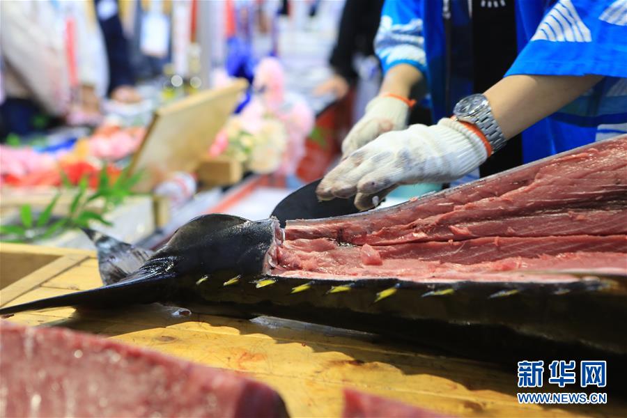 11月7日,來自日本長(zhǎng)崎魚市株式會(huì)社的專業(yè)切魚師傅在現(xiàn)場(chǎng)解體70公斤藍(lán)鰭金槍魚。第二屆中國國際進(jìn)口博覽會(huì)正在上海國家會(huì)展中心舉行。博覽會(huì)的食品及農(nóng)產(chǎn)品展區(qū)里匯集了來自世界各地的美食,同時(shí)也上演各種精彩美食秀。11月7日,來自日本長(zhǎng)崎魚市株式會(huì)社的專業(yè)切魚師傅現(xiàn)場(chǎng)解體一條70公斤的藍(lán)鰭金槍魚,吸引大量參觀者觀看、品嘗。新華社記者隋先凱攝