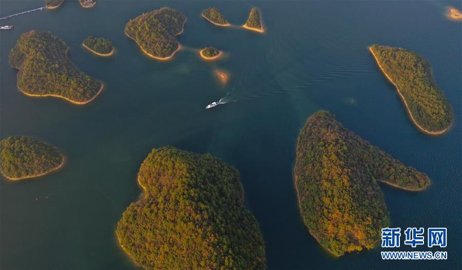 11月9日無人機拍攝的廬山西海。 當日,落日余暉下的江西廬山西海山青水藍,美不勝收。 新華社記者 周密 攝